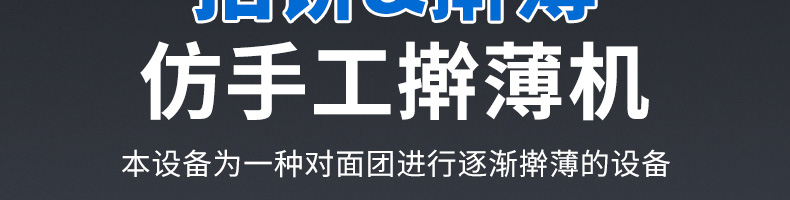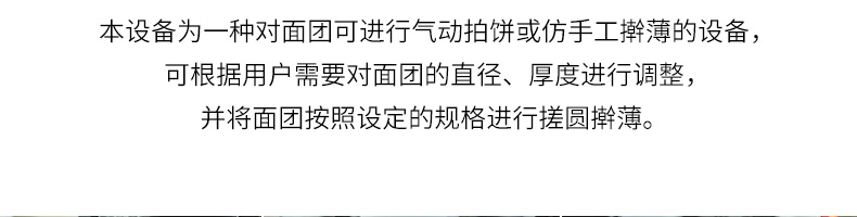XZ-150型擀薄機,為一種對麵團可進行氣動拍餅或仿手工擀薄的設備,可根據用戶需要對麵團的直徑、厚度進行調整並將麵團按照設定的規格進行搓圓摔擀薄。