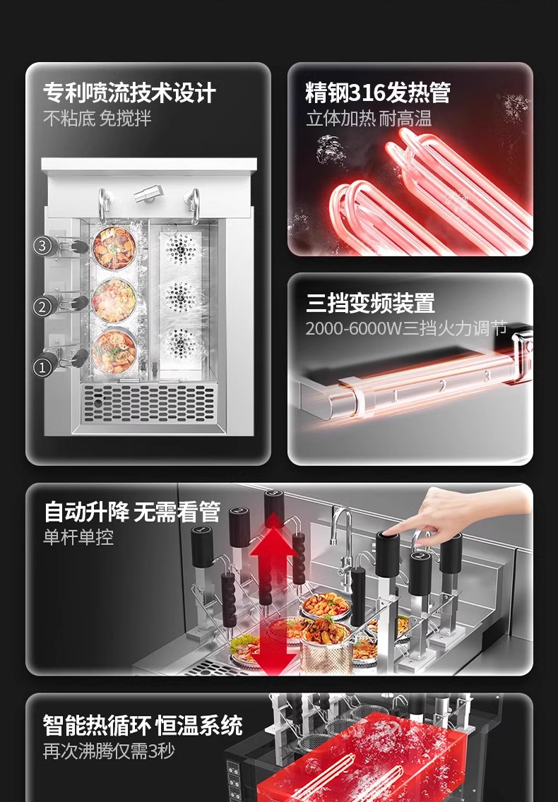 三合一煮麵爐,全新升級,自動升降再次沸騰,僅需3秒。316精鋼加粗發熱管、升級噴流技術、低功耗變頻技術。煮麵爐三合一升級,沸騰衝浪、變頻節能。