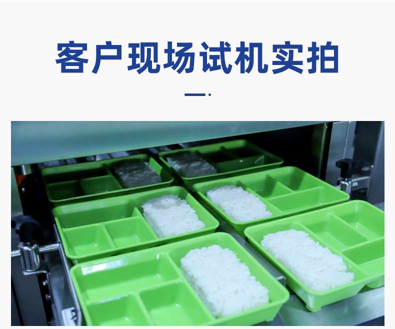米飯分裝機,適用多場合大型米飯加工中心、快餐公司、大型配餐中心企事業單位、學校食堂、釀造企業。米飯定量分裝,自動完成分飯和計量,精準飯量。米飯先扒鬆再分盒,能將米飯扒鬆分盒,使米飯更加鬆軟可口。