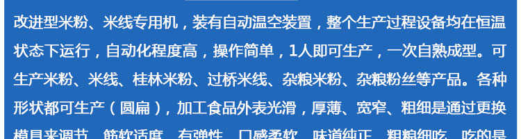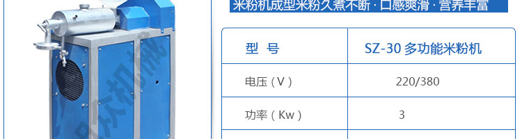SZ-30米粉機,生產多樣性可生產米粉、米線、粉絲、粉條、、年糕、玉米麵條、各種雜糧粉絲、各種麵條、雜糧麵條、彩色麵條以及以紅薯、玉米、大豆、蠶豆等製成澱粉為原料的等多種食品而且每種食品厚薄、粗細等規格可根據需要任意調整。