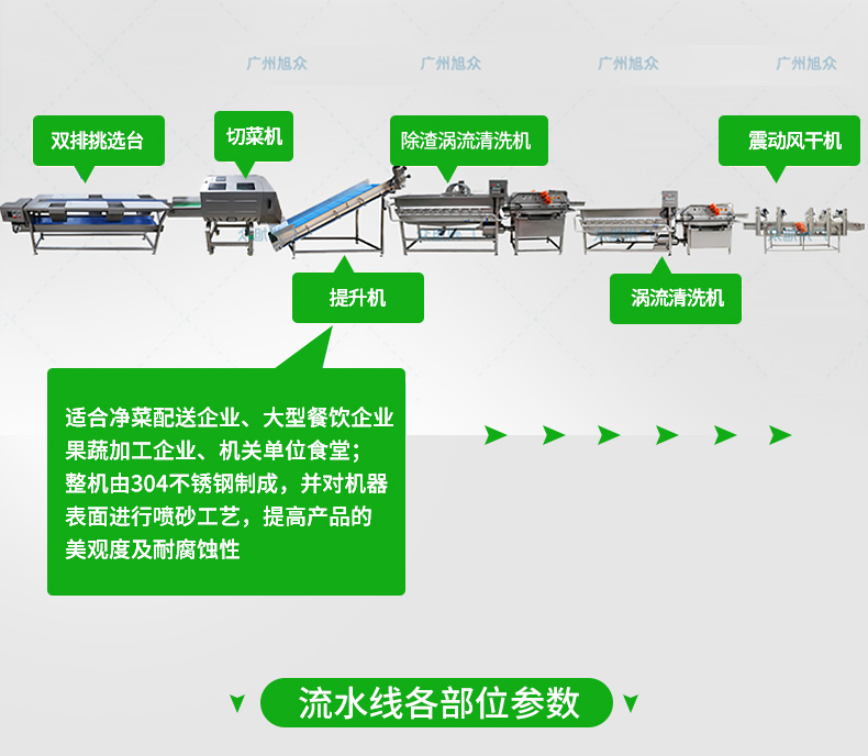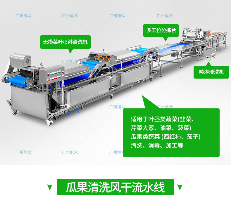 全自動大型葉菜清洗線,自動化程度高、整線設計合理、節約人工降低生產成本、外形美觀大方。主要用於葉菜加工,整線自動化淨菜生產此線將切割、清洗、風幹設備連接成線,適合芹菜、韭菜菠菜、大白菜高麗菜、大蔥等葉菜類蔬菜加工生產