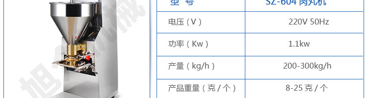 SZ-604肉丸成型機,肉丸成型機采用不鏽鋼材質,丸子直徑可達15-35mm,可以製作各類爽脆,有韌性、有彈性的豬肉丸、魚丸、牛肉丸、貢丸、雞肉丸等