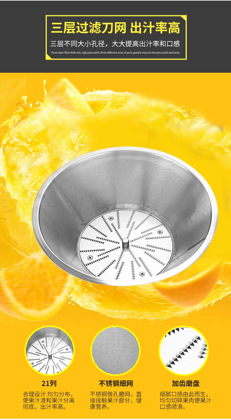 WF-A2000商用榨汁機,該機所榨出的汁液是現榨的原汁,不含任何人為的防腐劑、穩定劑、色素、香精、水等,凡與榨汁接觸的原件均為不鏽鋼和無毒塑料聚丙烯和 A.B.S,食用安全。
